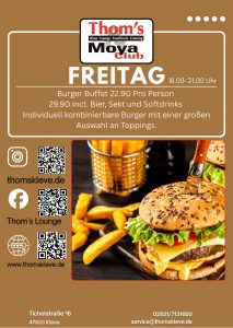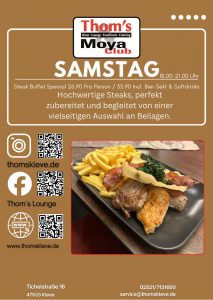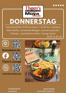 gerne mit Reservierung unter +49 2821 7131600 oder per E-Mail unter service@ThomsKleve.de (mit Angabe einer Rückruf-Nummer)