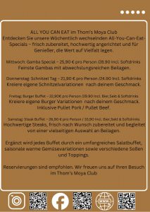 jeden Samstag von 18 Uhr bis 21 Uhr Steak Buffet Spezial für 26,90 € pro Person oder mit Flat für Bier, Sekt & Softdrinks für 33,90 € pro Person
